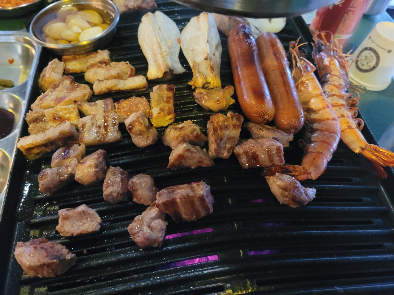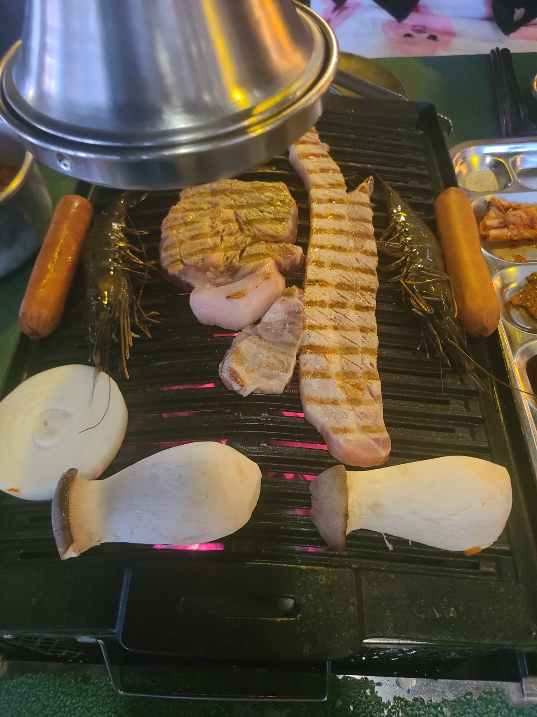 나온 고기와 새우, 소세지, 버섯을 한번에 올려주었습니다. 고기만 있는게 아니라 여러가지 있다보니 더 알차고 푸짐해보이네요. 특히 새우는 보시다시피 매우큽니다! 블랙타이거 새우라고 하네요. 거기에 소세지는 잔슨빌소세지라고하는데