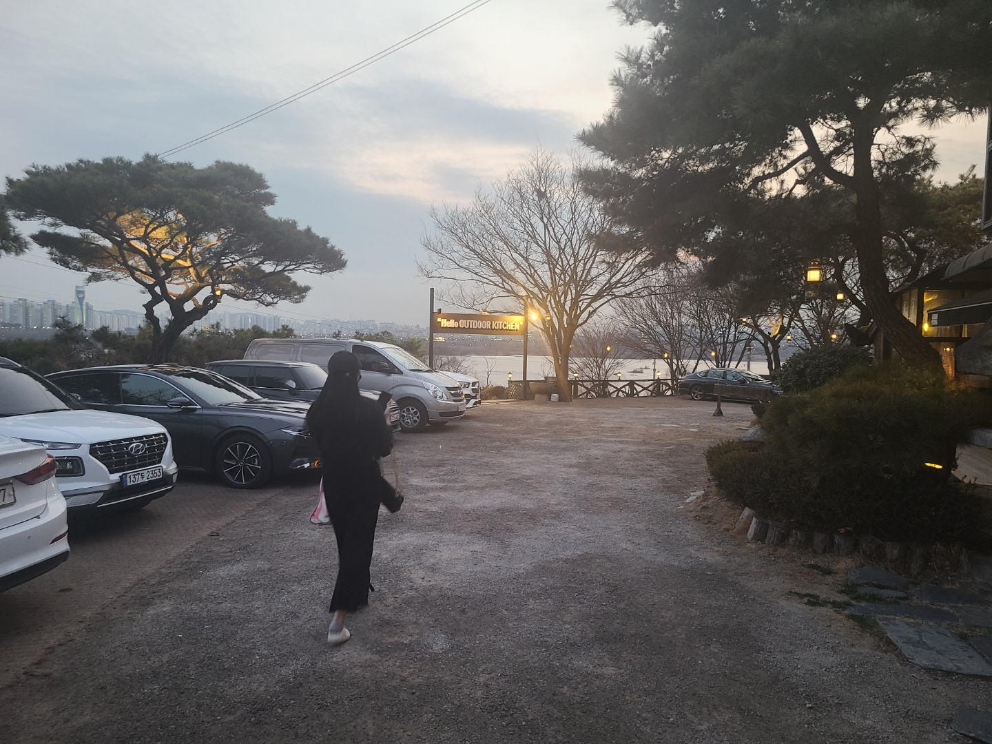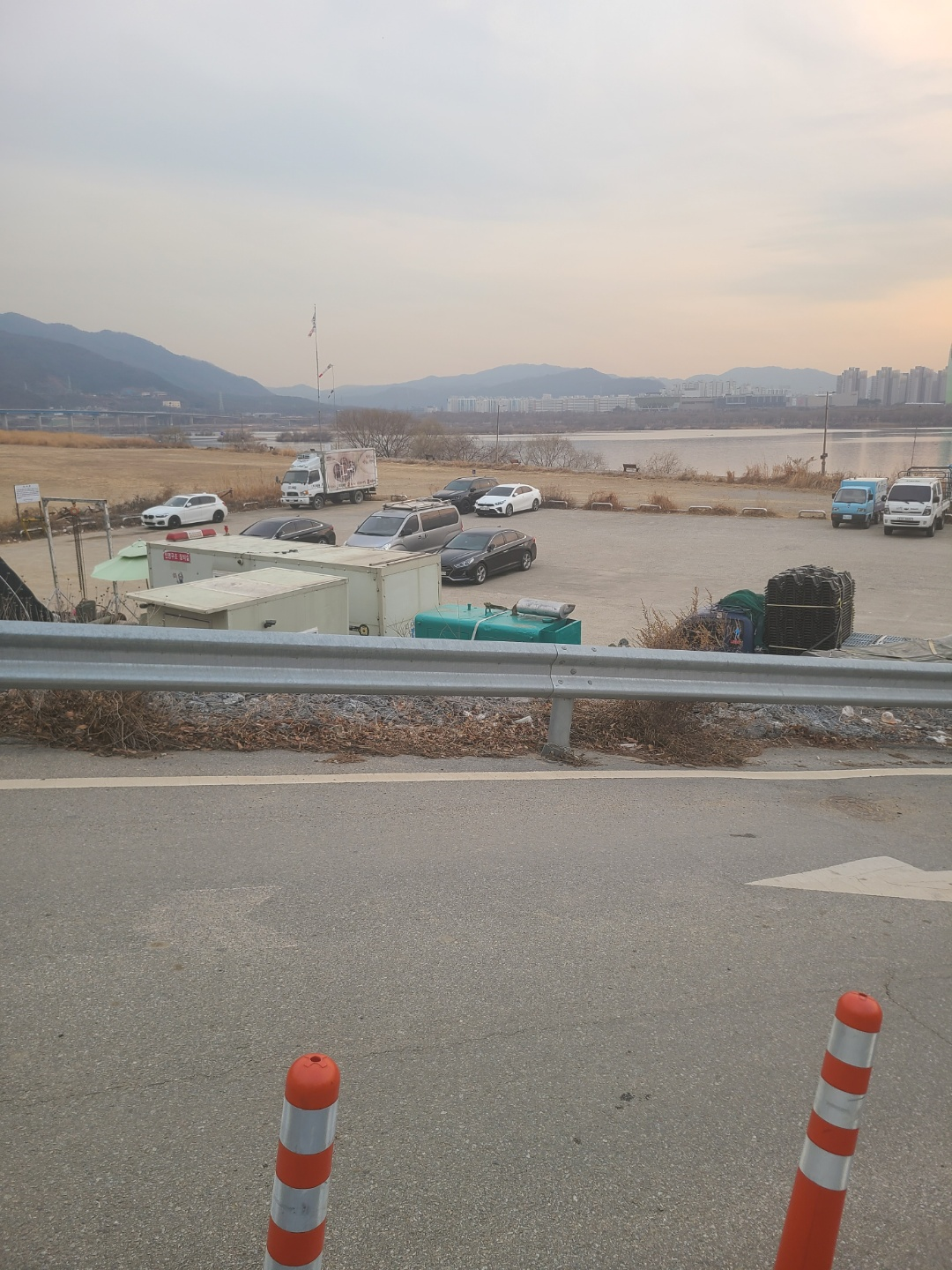 아웃도어키친은 옆에 한강을 따라서 있는 팔당 음식점들중에 하나입니다. 교통편의 버스가 있긴하지만 추천하지 않고 주차자리가 넓기때문에 꼭 자동차로 움직이시는걸 권해드립니다. 먼저 주차장은 두개가 있는데 하나는 간판 앞으로 들어오는 곳이고 나머지 하나는 간판뒤로 내리막길로 내려가는 주차장입니다. 내려오시면 아래사진과 같은 주차자리가 있기때문에 어느정도 넉넉한 편입니다.