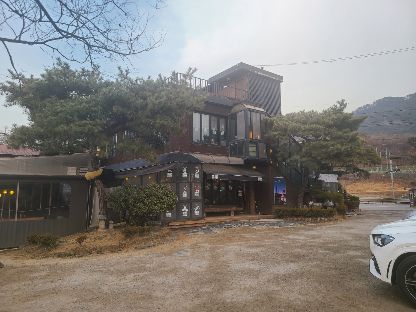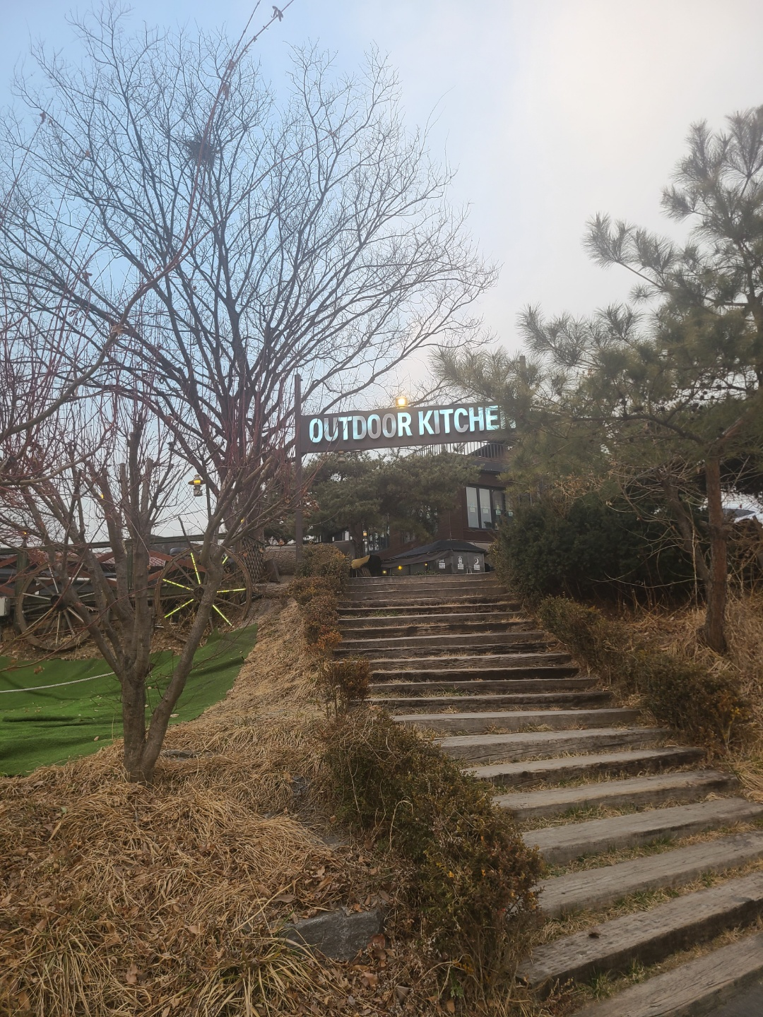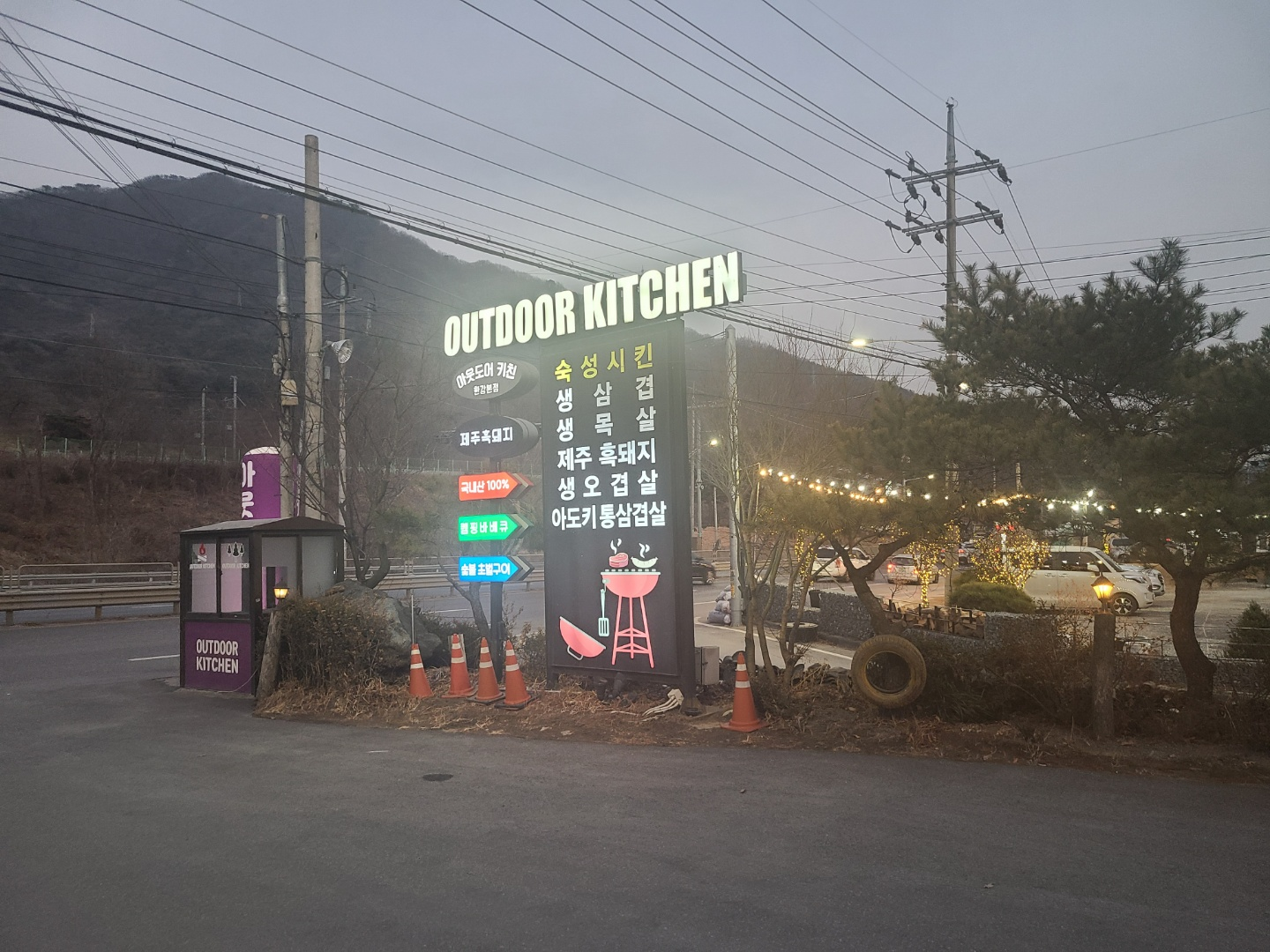 주차장에 올라오시면 이런 가게 보이는데 이 가게가 바로 아웃도어키친입니다. 가게 앞이 아까 말씀드린 첫번째 주차장입니다.