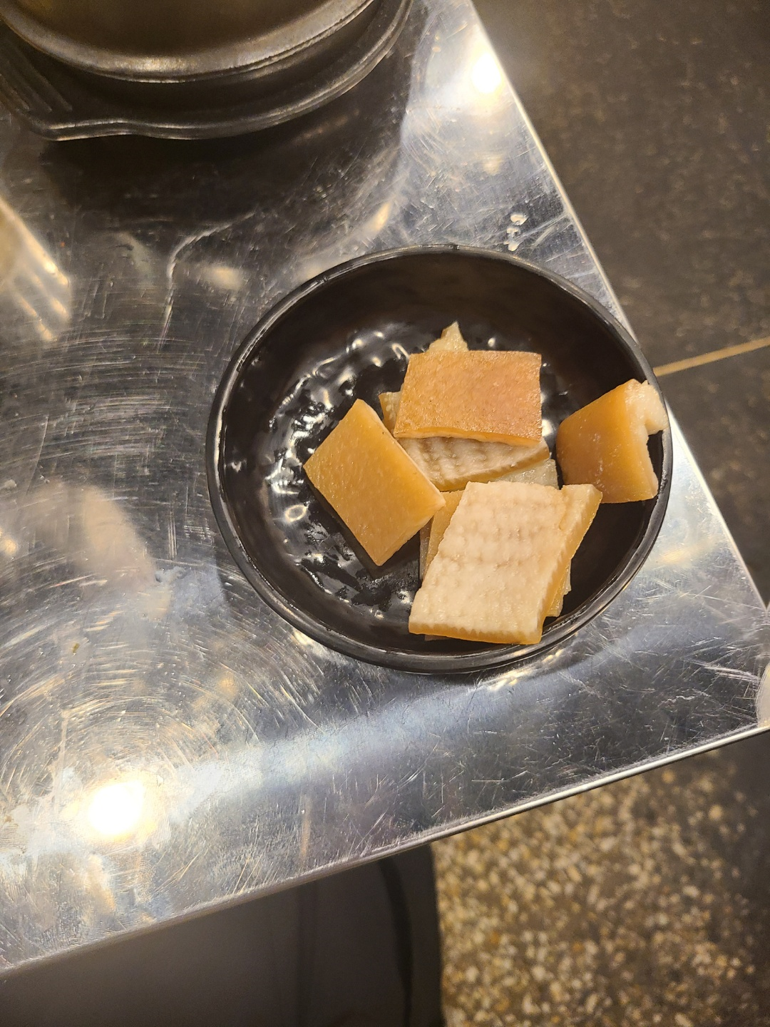 껍데기 리필!! 제가 껍데기를 좋아해서 리필받았습니다. 아 그리고 아시다시피 껍데기는 센불 한 가운데에서 오래구우면 뻥! 소리 함께 기름이 튀니 조심하세요~ (이런 말씀을 드리는 저도 한번 튀었습니다.. 여기오시면 중간중간 다른 테이블에서 뻥 소리가 들리실겁니다)