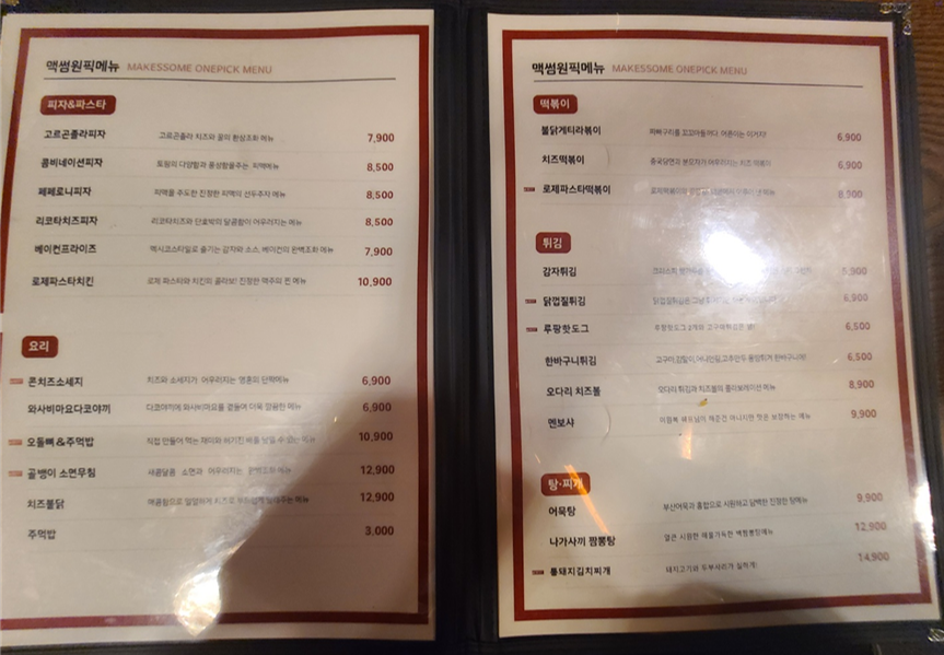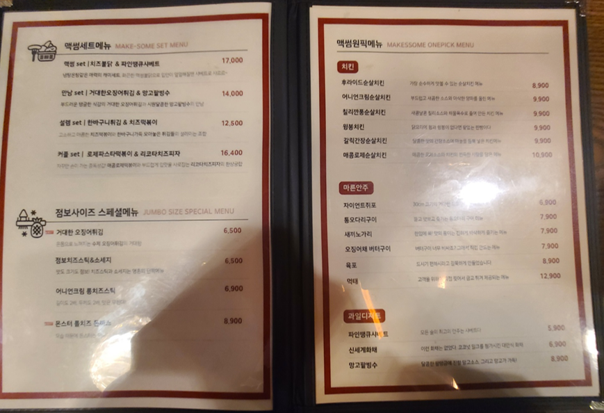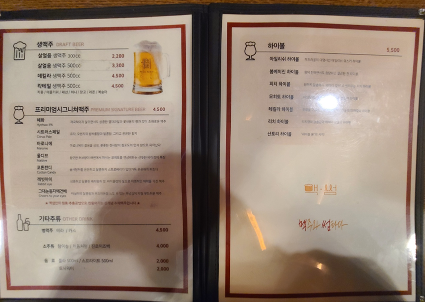 전체 메뉴를 보여드리기위해 전부 찍어왔습니다 ㅎㅎㅎㅎㅎㅎ 전체적으로 다양한 종류의 안주를 팔고 있습니다. 저희는 메뉴를 골..똘 하다가 고르곤졸라, 윙봉치킨를 안주로 고르고 그대눈동자에건배, 코튼캔디 라는 프리미엄 시그니처 맥주를 시켰습니다.