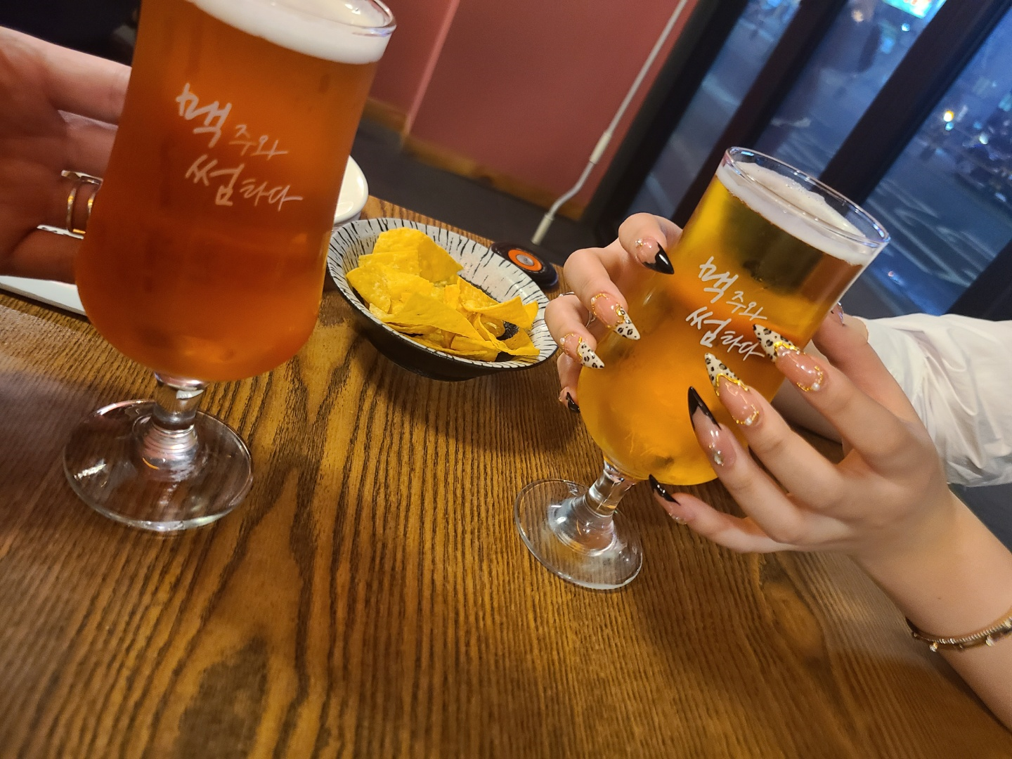 기본 안주와 맥주가 나왔습니다. 기본 안주는 가운데에 보이는 나쵸칩인데 살짝 짭짤한느낌이 들어 안주로 적당했습니다. 제가 기억하기론 대부분의 맥주집에서 나쵸칩이 기본안주로 나온경우는 고소한 맛이 나고 짭짤하지 않은 경우가 대부분이였는데 여기는 살짝 짭짤해서.. 저는 좋아했습니다 ㅎㅎㅎㅎ