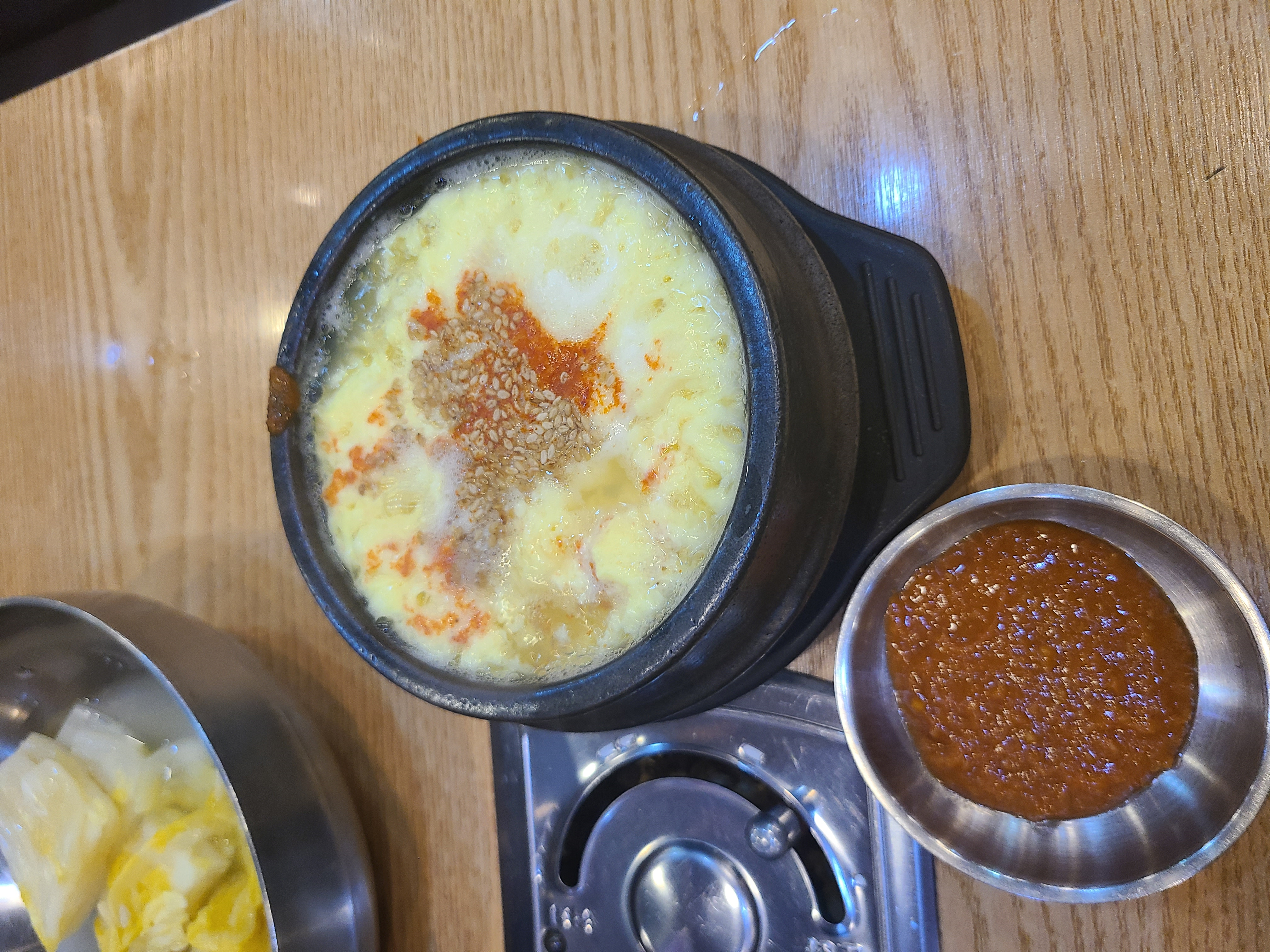 계란탕 사진입니다. 계란탕이라는 이름을 쓰지만 계란찜이랑 거의 비슷하니 계란찜으로 생각하셔도 됩니다. 위에 빨간것들이 보이는데 저는 처음에 날치알같은 종류라 생각했지만 양념이였습니다. (좌측에 살짝 뭐가 묻은거는 저희가 한입 먹다가 묻은겁니다..)