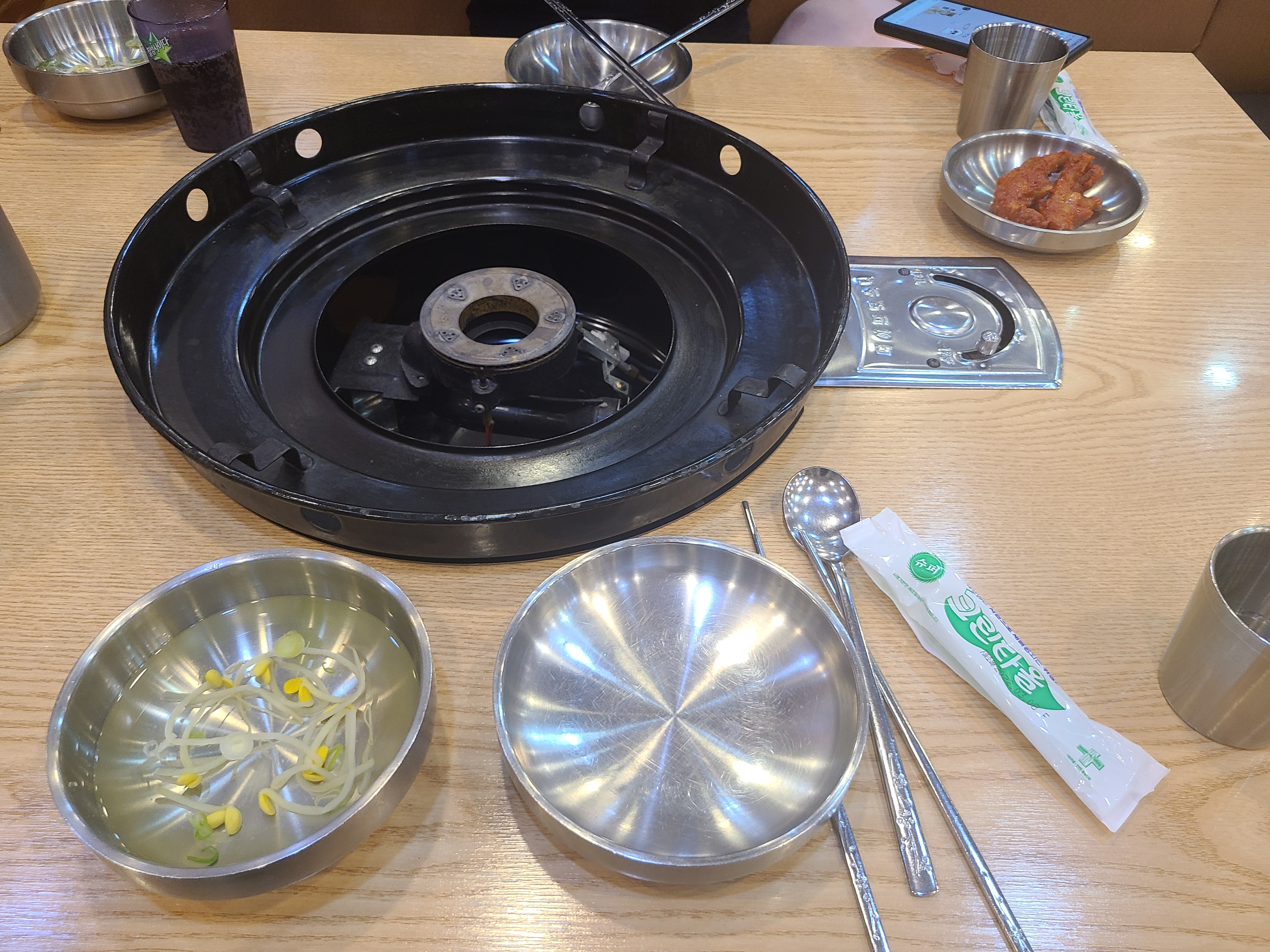 밑반찬으로는 인당 하나씩 나오는 맑은 콩나물국, 닭발 그리고 사진에 안보이지만 쌈채소, 백김치, 쌈장 등이 추가로 나옵니다.