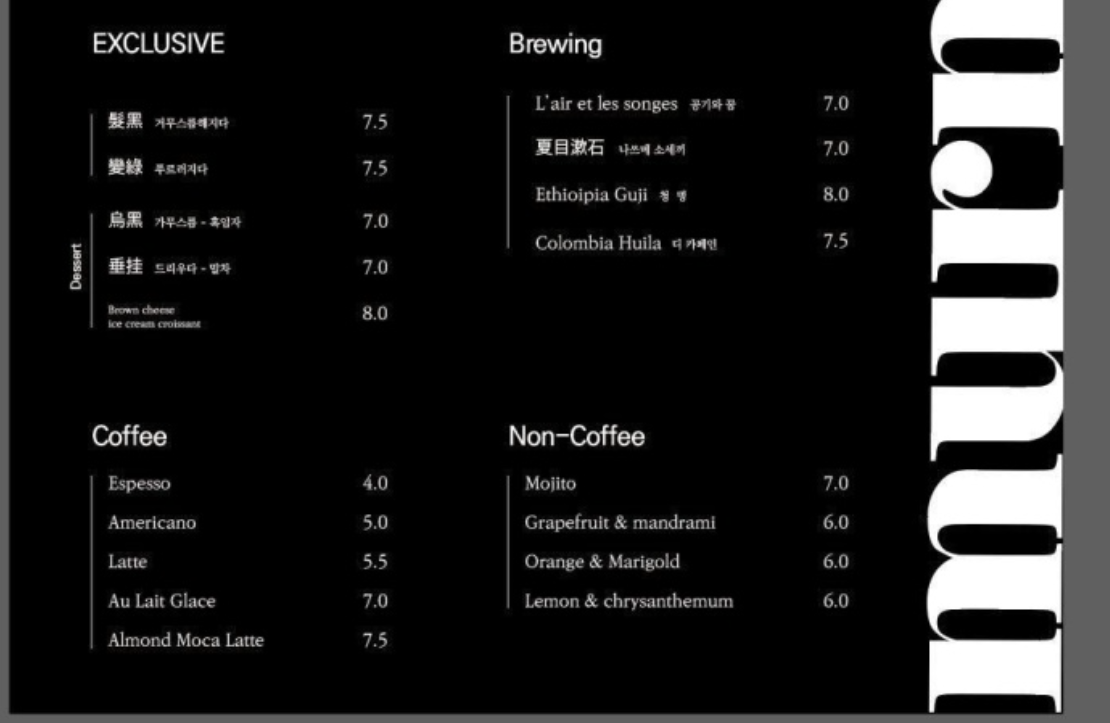 메뉴판입니다. 솔직히 좀 이해하시기 힘든 메뉴일 수 있지만 걱정마세요. 카페 주인께서 하나하나 설명해주십니다. 주인분이 정말 친절하시고 잘 생기셨어요(저는 남자에요) 일단 메뉴에 대해 간략히 설명드리자면 거무스름해지다 푸르러지다 이 두가지가 주 메뉴인데요 각각 흑임자라떼, 말차라떼입니다. 그 아래는 디저트이구요 Brewing에 있는 것은 전부 산미가 있는 원두인데요.