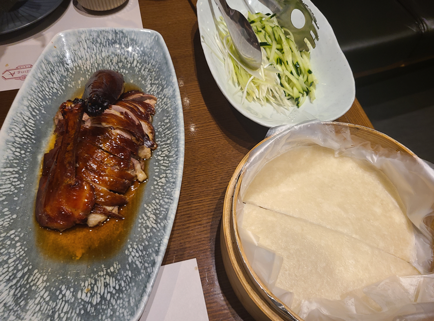 메이징 덕입니다. 오른쪽 밀전병에 고기와 야채를 싸서 소스에 찍어먹는 방법인데요 솔직히 저는 매우 맛있었습니다. 메이징덕은 무조건 소스에 찍어먹는 것을 추천합니다. 한번은 그냥 안찍어먹고 먹었는데 그러면 급이 좀 낮아져서요