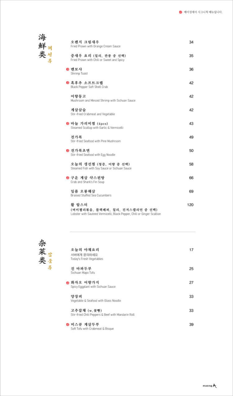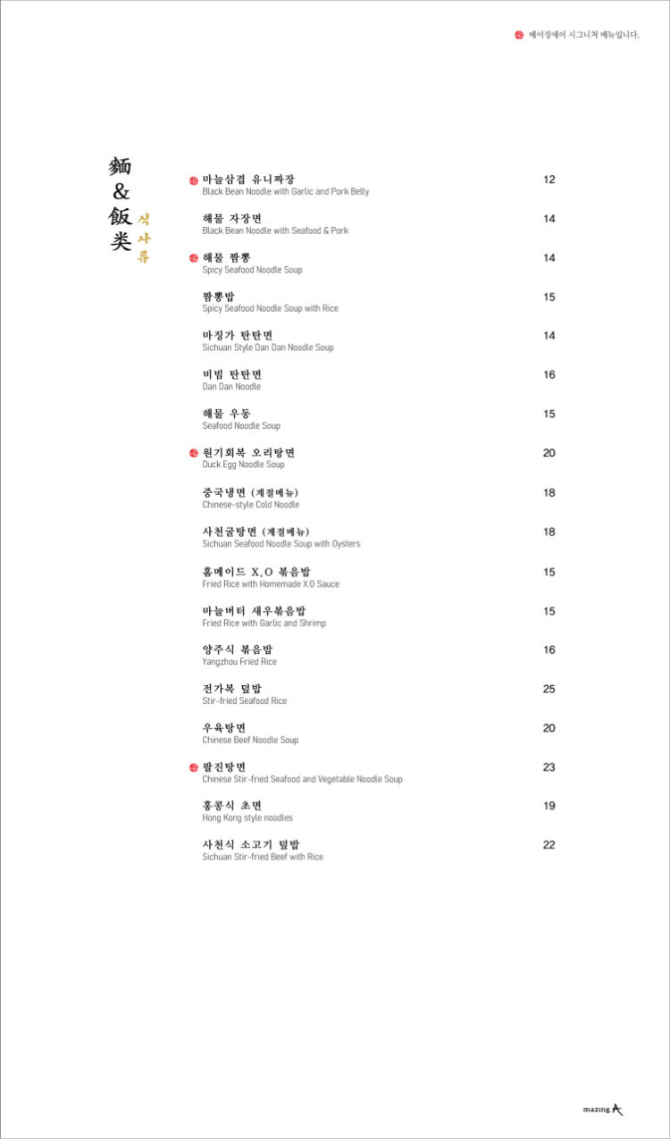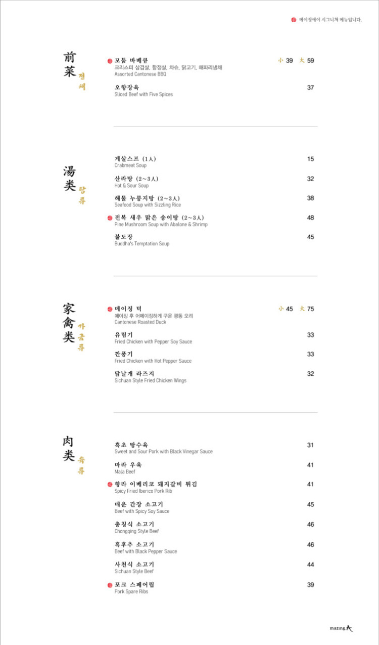 메뉴판입니다. 제가 못찍어서 공식 홈페이지에 있는 메뉴판을 가져왔구요. 세 가지의 코스요리가 있는데 저희가 내키지않아하는 메뉴도 포함되어있기때문에 저희는 요리와 식사메뉴를 시켰습니다. 요리는 대표메뉴인 메이징 덕과 칠리새우, 충칭식 소고기, 그리고 짬뽕을 시켰습니다.