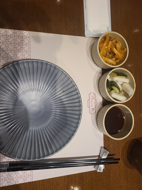 테이블 셋팅입니다. 짜사이와 메이징덕 소스 그리고 오이장아찌입니다. 짜사이는 기름지지 않아서 좋았구요 오이 장아찌는 생오이의 맛이 살아있으면서도 장아찌 느낌도 나서 좋았습니다. 굉장히 신기했습니다