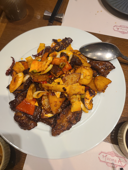 충칭식 소고기입니다. 여기에 고수를 따로 주시는데요 여자친구가 고수를 못먹어서 저만 따로 얹어서 먹었습니다. 기본적으로는 뿌려서 드시라고 하시더라구요. 이 요리는 고추기름과 여러 향신료에 볶은 요리인데요 자극적인 맛이여서 저와 여자친구 입맛에는 맞았습니다. 특히 감자에도 간이 잘 배어서 감자도 맛있게 잘 먹었습니다