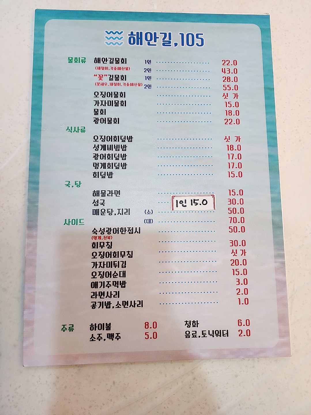 메뉴판입니다. 저희는 해안길물회 2인만 시켰습니다. 이 날은 "꽃"길 물회는 안 됐습니다.