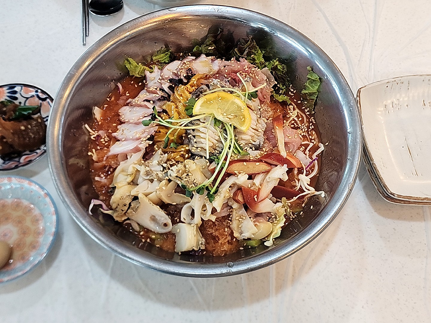 후기를 말씀드리면 맛은 여러가지 신선한 해물이 들어간 물회답게 매우 맛있게 잘먹었습니다. 다만 매운거 못드시는 맵찔이분들은 처음엔 맛있더라도 중간부터는 살짝 스읍하시면서 드실 수 있습니다