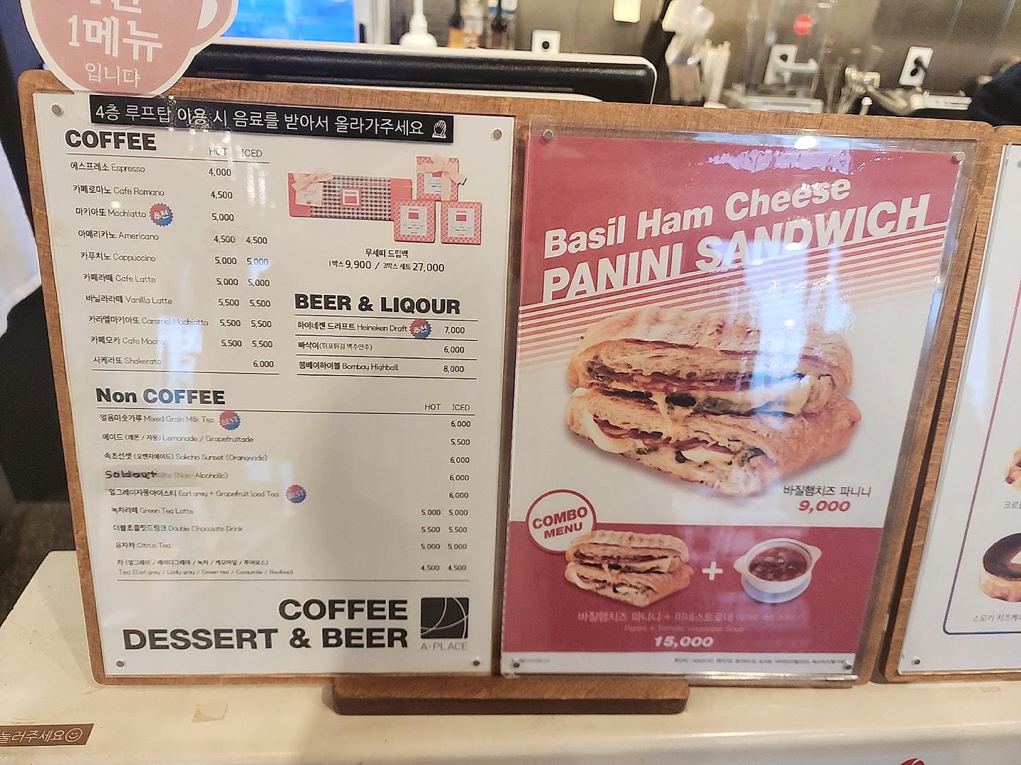 메뉴판입니다, 오른쪽 사진은 좀 흔들린거 같네요. 여러 디저트와 음료가 있고 심지어 맥주도 판매하고있습니다. 하지만 저흰 식사 직전이라 아메리카노만 시켰습니다.